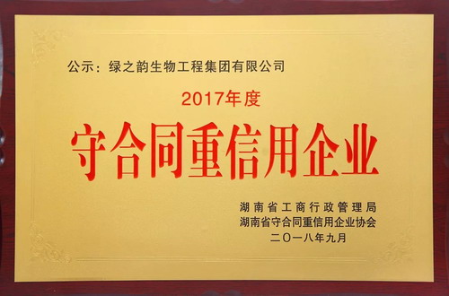近日,湖南省工商行政管理局、湖南省守合同重信用企业协会发布了《2017年度湖南省守合同重信用企业名单公示》。凭借完善的企业诚信建设体系与科学的企业管理水平,经过层层审核的严格评定,绿之韵集团再次荣获湖南省“守合同重信用”企业称号。