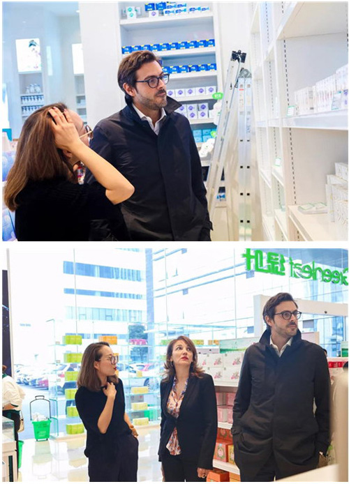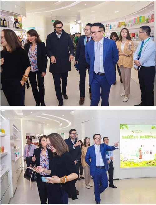 下午2时,亚历山大总裁与米安娜总监抵达绿叶总部,徐建成董事长携集团高管热情迎接,并陪同二位绿叶老朋友全面参观了绿叶总部旗舰店与产品展厅等处,深入了解一年来绿叶发展新变化。在简洁大气的旗舰店中,琳琅满目的商品,熙熙攘攘的顾客,热火朝天的抢购氛围获得亚历山大总裁与米安娜总监的连连称赞。