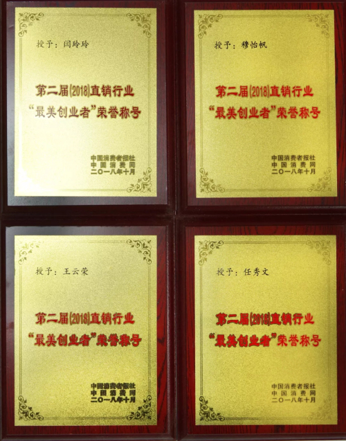 本次会议中,中国消费者协会副秘书长刘清女士、中国消费者报社副总编辑杜长红女士为43位最美创业者分别颁发了“2018年度直销行业最美创业者”荣誉证书。和治友德营销精英闫玲玲女士、穆怡帆女士、王云荣女士、任秀文女士获此殊荣。