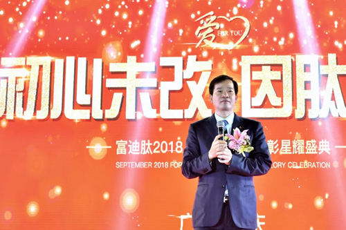 他强调,富迪公司以“我们所做的一切都是为了爱”为发展理念,贯穿到企业的方方面面,富迪公司的目标就是“办人民满意的企业,做对人民有益的品牌”,心怀感恩之心,带着这份大爱承担起爱国为民的社会责任。富迪今天的诚信品牌形象塑造,离不开每个研发团队及工作人员的匠心精神,以及所有幕后竭力付出的人们,用实践赢得发展。我们一定要让每一个由富迪打造的品牌,流传久远、惠泽后代。我们要以“新思想、勤创新”为指引,在开创健康时代、开启新征程、立下新目标、续写新篇章的征途上大胆前行。