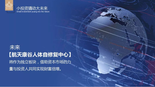 航天康谷人体自修复中心,将作为独立板块,借助资本市场的力量与投资人共同实现财富倍增!