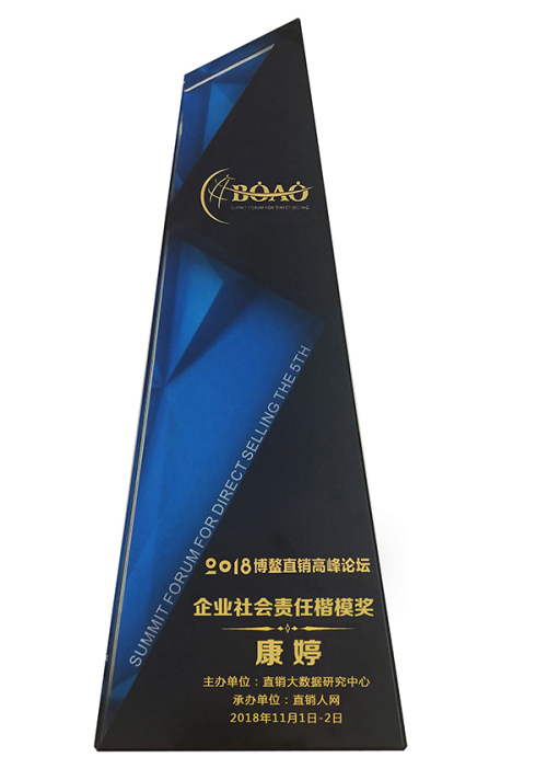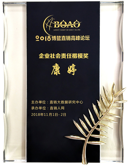 本届论坛会议中隆重揭晓了2018年度“金顶奖”的评选结果。“金顶奖”以最专业的平台和最公正的评选方式,评选出本年度直销行业中的精英企业、优秀团队、杰出个人,为广大直销从业者提供具有参考价值的创业风向标。其中,天津康婷公司董事长刘小兵先生荣获“年度影响力企业家奖”;康婷公司荣获2018博鳌直销高峰论坛“企业社会责任楷模奖”。