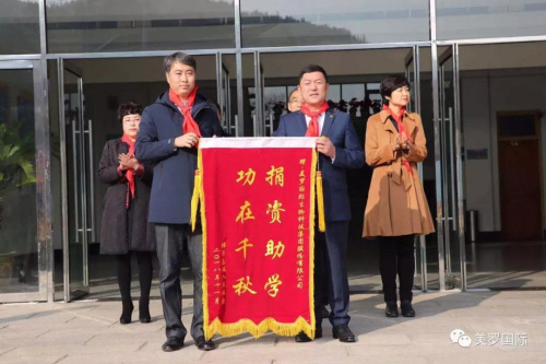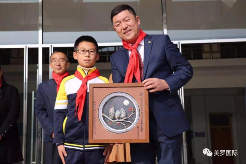同时,副总裁于镇豪先生代表美罗国际集团捐赠40万元助学金,并为学生们带来了体育用品。獐子岛镇长单文华先生向美罗国际集团回赠锦旗,可爱的学生们还献上了自己亲手制作的小礼物。