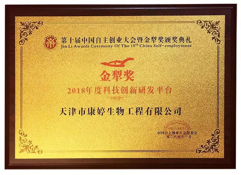 作为推动中国企业、创业领袖成长的舞台,“金犁奖”创设于2009年,至今已经成功举办过九届,记录着无数创业之星的蜕变和辉煌。在“第十届中国自主创业大会暨金犁奖颁奖典礼”中,康婷公司在科技赋能的新业态下,不断探寻新思路,凭借科技创新的蓬勃发展荣膺“2018年度科技创新研发平台”金犁奖。