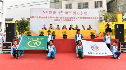 温暖的脚步永无止境,“让爱传出去”也永远没有终点。2018年12月3日,尚赫公益基金会继续深耕公益事业,弘扬慈善文化,成功援建第184所广西壮族自治区南宁市宾阳县思陇镇昆仑村尚赫韦玲小学。每一所尚赫公益小学的建立,都诠释着尚赫独具特色的品牌文化,创新型公益思路开创了业界先河,建立了完善的爱心网络,也取得了显著的爱心成绩。