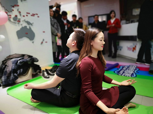 说运动不如动一动,听完讲座,准爸妈们来到一楼咖啡厅,宝宝的健康不止是妈妈的事儿,在专业瑜伽老师的带领下,了解体验夫妻双人瑜伽。瑜伽能训练人体的平衡感、力量和柔韧度,夫妻一起运动,也有助于提升准妈妈们在孕期的心情、状态。