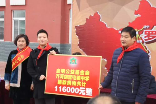 12月5日,在众多爱心人士的参与下,“启明公益万里行——阅读点亮人生”活动走进山东省齐河县胡官镇中心学校,向该校捐赠了3000余册、价值10万元的中小学图书,同时,爱心人士还自发地为困难的孩子捐赠了爱心水杯和书包,让孩子们感受到了社会的温暖与呵护。