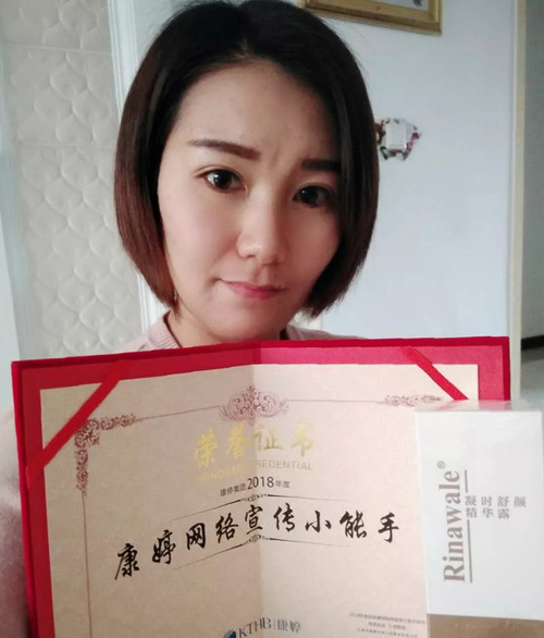 大家好,我是王爽,感谢康婷集团举办的“为康婷正能量代言,我是康婷网络宣传员”,很荣幸在本次活动中能荣获“康婷网络宣传小能手”称号,更感谢集团赠送的精美产品。我将持续关注康婷集团的微信公众平台,并推广给有需要的家人,树立我们的大健康品牌理念。让我们相聚在2019年,加油。