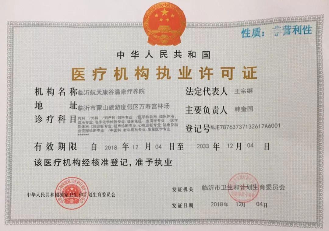 山东卫康集团投资兴建的蒙山卫康航天康谷温泉疗养院,临沂市第二家疗养院许可证