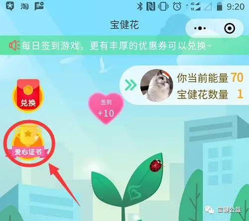 4、通过宝健花小程序注册宝友卡,可额外获得100爱心能量