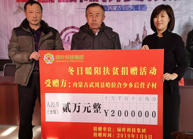 2019年1月9日下午,绿叶科技集团内蒙古分公司及绿基金爱心志愿者携手内蒙古呼和浩特市工商局、金桥工商分局,向内蒙古呼和浩特市武川县哈拉合少乡后营子村捐赠价值2万元的生活必需品,在严寒的冬日为当地贫困村民送去了温暖。
