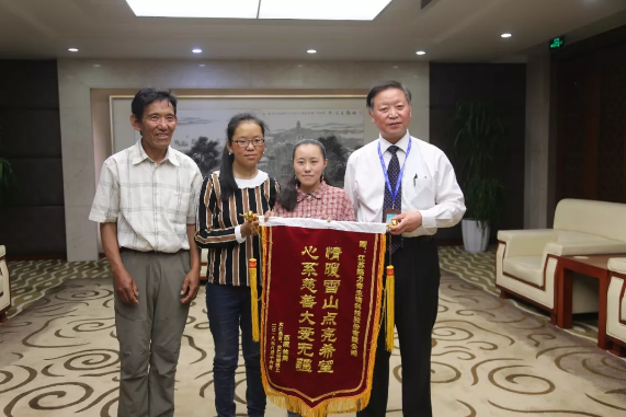 ▲西藏斜视患者次仁拉姆、次仁曲吉及父亲赠送徐董锦旗
