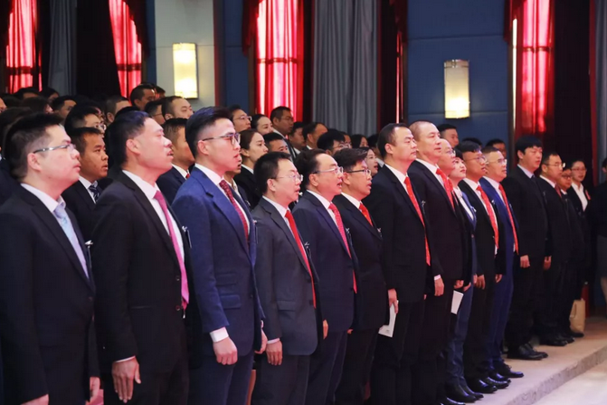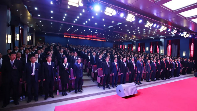 全体与会代表起立高唱国歌、龙润企业歌、理想企业歌