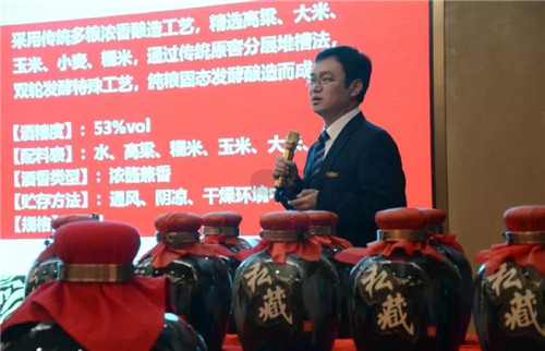 常德公司新上市的国草封坛酒也在活动中首次亮相,株洲科丽泰生物科技有限公司技术总监汪陈平为大家做了详细的介绍,精选15年基酒原浆,酒体采用传统多粮浓香酿造工艺,精选高粱、大米、玉米、小麦、糯米,通过传统原窖分层堆槽法,双轮发酵特殊工艺,纯粮固态发酵酿造而成。国草封坛酒采用精美的10L大坛灌装,酒精含量53%Vol,是一款浓酱兼香型优质白酒,其独特的优势与收藏价值也引起了大家的广泛关注和讨论。