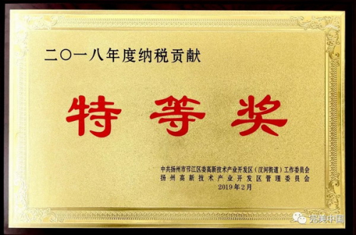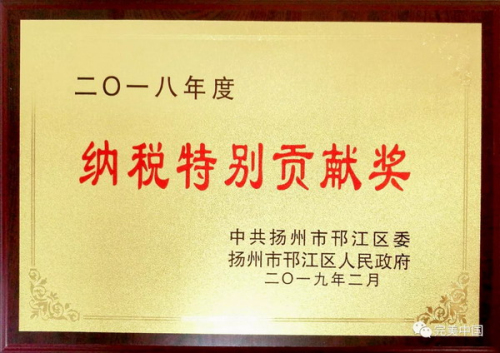 纳税总额超6亿 扬州完美获纳税特别贡献奖