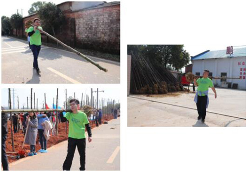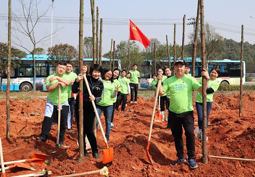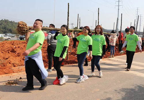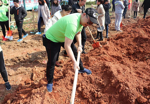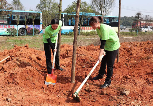 上午十时许,绿之韵家人们一行统一乘坐着大巴车来到了种植区。在领取完自己的锄头、铲子等劳动工具之后,绿之韵家人们兴致高昂地投入到了植树造林的行动中……