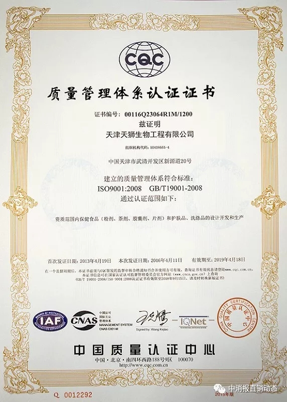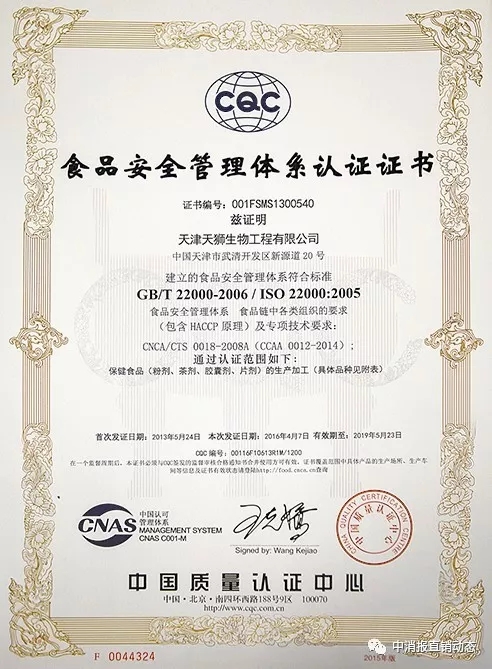 为了给全球天狮消费者提供符合各个国家规范的绿色食品,其质量管控标准综合了各国的法律法规,打造出了属于自己的一套质量管理和食品安全防护体系,产品安全管理达到国际先进水平。在许多国家,天狮产品就是高品质、绿色健康产品的代名词。作为中国率先通过HACCP食品安全管理体系认证的大型保健食品生产企业,天狮集团还通过了ISO9001质量管理体系认证、ISO22000食品安全管理体系认证、ISO17025国际实验室管理体系认证等,同时符合《保健食品良好生产规范》(GMP)要求。