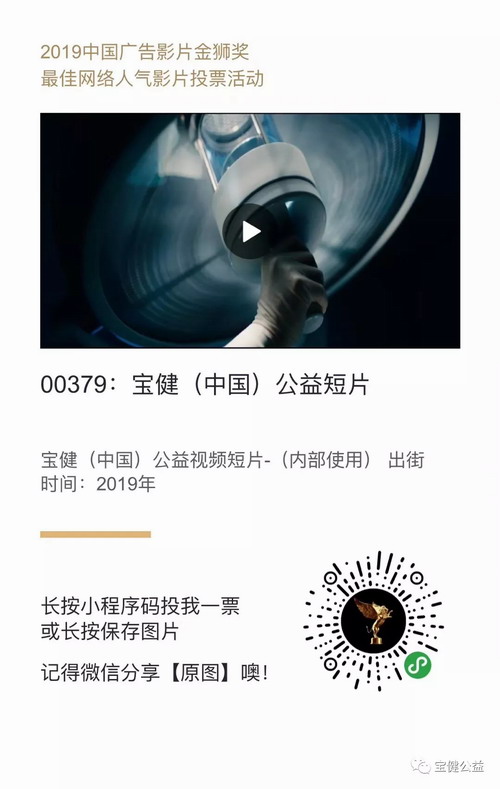 被称为“中国广告影视界的奥斯卡”的2019中国广告影片金狮奖正在激烈角逐当中,宝健公益微电影被推选为“最佳网络人气影片”的候选影片,目前正在投票阶段,投票入口请见下方: