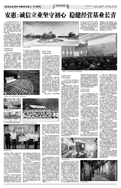 安惠公司坚决拥护和响应国家大力打击“保健”市场违法违规行为,净化消费环境歪风邪气的举措。2019年1月,安惠公司召集各部门负责人召开诚信经营专题会议,落实“百日行动”部署;2019年2月,在2019直销企业保护消费者权益3·15座谈会上,安惠公司签署了《直销企业规范经营自律承诺宣言》,承诺严格按政策法规要求及宣言内容开展生产、经营活动,充分发挥企业在整治保健市场乱象、拒绝夸大虚假宣传和严格规范经营等方面的市场主体作用。安惠会一如既往地规范自身言行,传播正能量,保障消费者的权益,维护公司和产品的良好信誉。