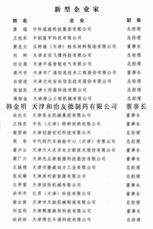 韩金明董事长凭借创新精神及全球视野,入选天津市“新型企业家培养工程”。