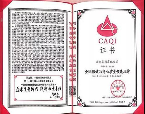 多年来,天狮产品不但销量受到市场认可,质量方面也深得消费者的信任。2018年,天狮集团参与了“3.15”产品和服务质量诚信承诺企业评选活动,获“全国保健品行业质量领先品牌”奖。