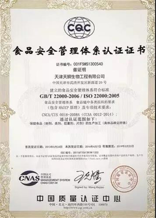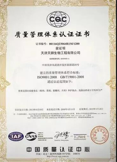 作为中国第一家通过HACCP食品安全管理体系认证的大型保健食品生产企业,天狮集团还通过了ISO9001质量管理体系认证、ISO22000食品安全管理体系认证、ISO17025国际实验室管理体系认证等,同时符合《保健食品良好生产规范》(GMP)要求。