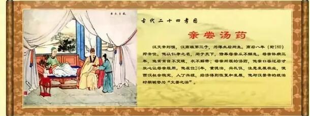 《二十四孝》中,汉文帝为母亲尝汤药的故事广为流传:母亲久病卧床,文帝日夜守护在床前,亲自煎药。每次煎完,自己总先尝一尝,看看汤药苦不苦,烫不烫,自己觉得差不多了,才给母亲喝。