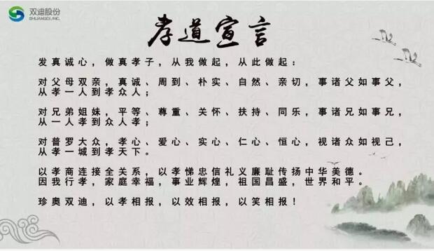 能成为双迪员工的首要条件就是遵守孝道。对此公司专门制定了独有的《孝道宣言》,成为员工入职的道德衡量标准之一。“发真诚心 做真孝子,从我做起,从此做起:对父母双亲,真诚、周到、朴实、自然、亲切,事诸父如事父,从孝一人到孝众人……”从对自己父母的衣食住行的小孝做起,才能做到对其他的人无私奉献的大孝。这也和一千多年前蜀汉的开国皇帝——刘备的“不以善小而不为”的道理有异曲同工之妙。