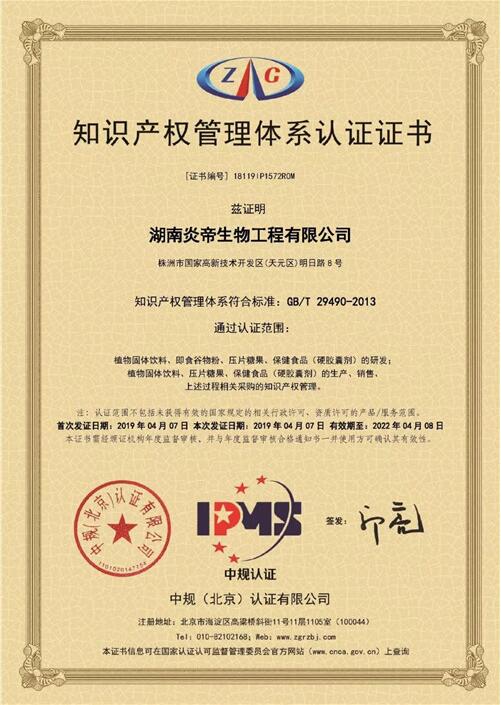 2019年4月11日,湖南炎帝生物工程有限公司凭借规范完善的知识产权管理体系,喜获国家《知识产权管理体系认证证书》,表明公司在知识产权管理方面达到国家标准,将有力地促进炎帝生物在创新能力和核心竞争力建设,进一步推动以中医体质辨识为特色的健康管理中心及省微藻工程技术研究中心在科研创新领域创造更大价值。