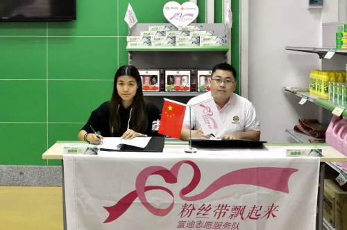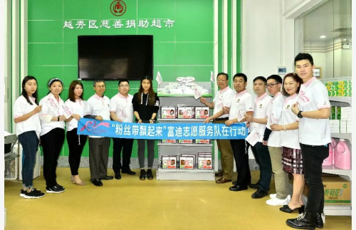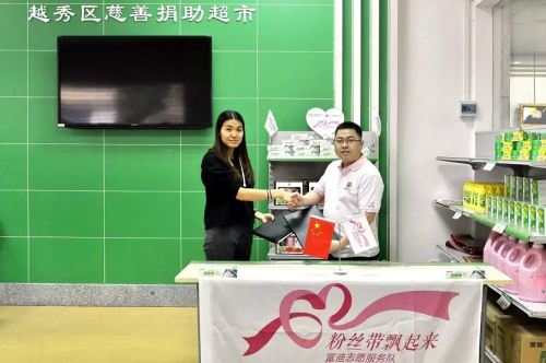 4月16日下午,太阳露出了久违的笑脸,“粉丝带飘起来”富迪志愿服务队为了践行“我们所做的一切都是为了爱”的企业文化,弘扬中华民族扶贫济困的传统美德,推动慈善事业的发展,在广州市越秀区慈善捐助超市举行了以“大爱无边,扶贫济困”为主题的爱心捐助活动,并在超市内设立产品慈善专柜,现场向慈善专柜捐赠了价值人民币5000元的爱心物资。富迪长成国际商学院执行院长陈震先生,广东省富迪慈善基金会秘书长郑军华先生,广东省富迪慈善基金会理事陈渭东先生,广东省富迪慈善基金会干事余嘉慧女士,“粉丝带飘起来”富迪志愿服务队代表王长雄先生,广州市越秀区慈善会秘书长麦少贤女士,富迪经销商代表以及“粉丝带飘起来”富迪志愿服务队部分成员出席了此次活动。