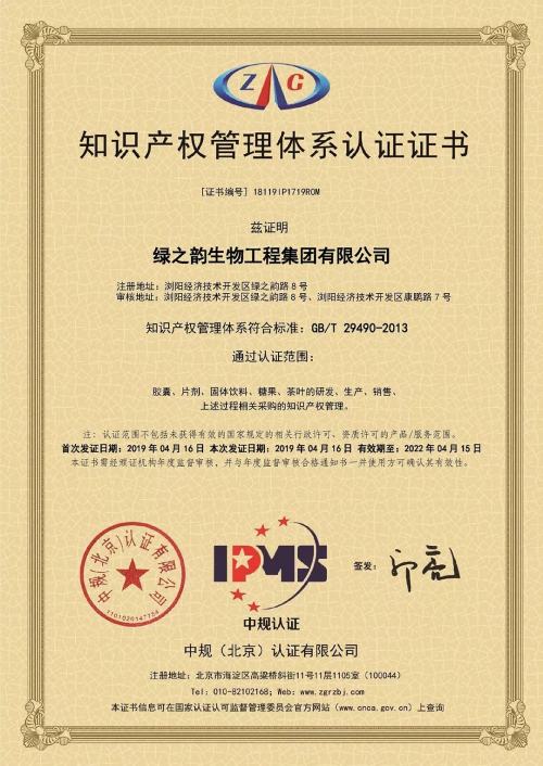 近日,绿之韵集团知识产权管理体系符合国家标准GB/T29490-2013,胶囊、片剂、固体饮料、糖果、茶叶的研发、生产、销售的知识产权管理通过认证,获得颁发《知识产权管理体系认证证书》,证书编号:18119IP719ROM,成为行业内率先通过知识产权贯标认证的企业之一。