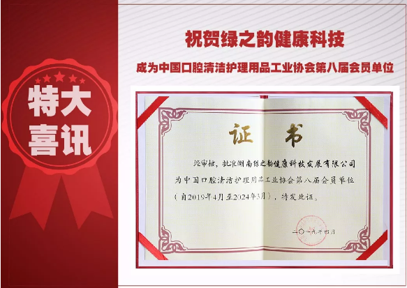 近日,绿之韵健康科技获得了中国口腔清洁护理用品工业协会同意入会的批复并颁发证书,标志着绿之韵健康科技正式加入中国口腔清洁护理用品工业协会,并成为协会第八届会员单位。