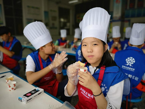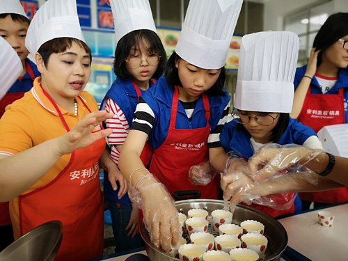同学们在安利志愿者帮助下制作纸杯蛋糕