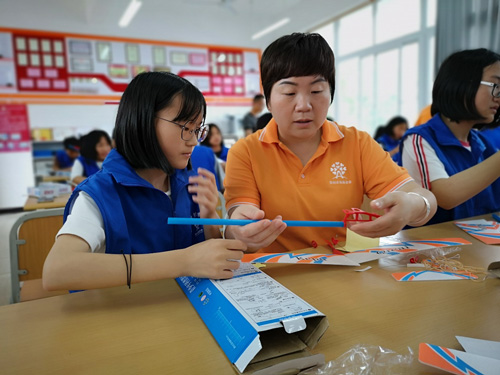 安利志愿者们协助同学们拼装航模