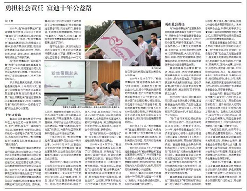 6月3日,《中国经营报》刊发了富迪健康科技有限公司接受记者采访,题为《勇担社会责任富迪十年公益路》的文章,采访文章用精炼的文字重点介绍了富迪公司十年来弘扬爱国主义精神,持续开展扶贫济困、安老扶幼等慈善公益活动,在扶贫、济困、安老、扶幼、助学、救灾、绿色环保等领域做出了积极贡献。