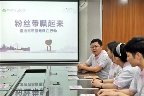富迪公司是富佑集团于1994年在上海设立的一家集科研、开发、生产、销售、服务于一体的现代化企业,始终秉承“大爱无边,我们所做的一切都是为了爱”的文化理念,积极践行社会责任。“粉丝带飘起来”志愿服务队便是富迪公司“爱的结晶”。
