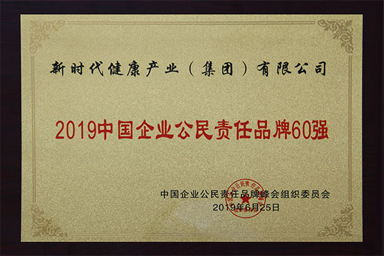 6月25日,2019第四届中国企业公民责任品牌峰会在北京举行,大会现场发布“2019中国企业公民责任品牌60强”榜单,新时代健康产业集团荣耀上榜,摘得“2019中国企业公民责任品牌60强”大奖。