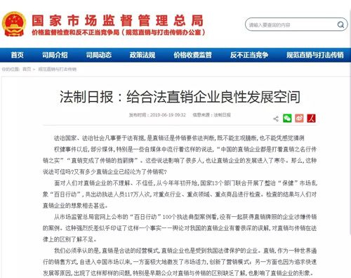 它强调了直销是一种合法的经营模式,直销企业是受到我国法律保护的企业,并肯定了直销自进入中国市场以来,对激发市场活力和创新营销模式所起到的积极作用。同时也指出行业内存在的某些乱象,暴露出了部分企业发展不规范的问题,这是造成此次行业信任危机的根本原因所在,但如果就这样将整个行业一棍子打死,显然“有失偏颇”,文章最后说道:“保护企业依法公平有序竞争,是法治国家的本意,客观、理性分析,为企业的发展创造良好舆论环境是媒体的责任。不能让一些不客观的评论、说法,成为整个直销行业规范发展的枷锁。”