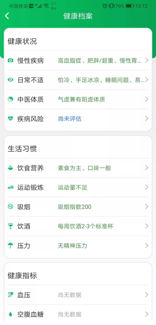 用户完成健康评估,会为用户建立个人近期的健康档案,并按照健康问题、生活习惯、健康指标分别存储展示。用户在每一项目中可直观的看到自身的健康状况,点击可查看详细说明并进行重新评估。