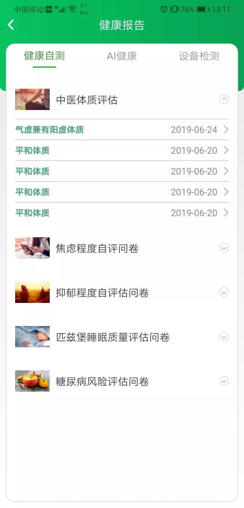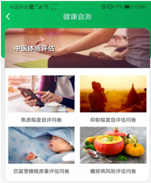 健康自测功能作为评估问卷的合集,包含了中医体质评估量表、焦虑评估、抑郁评估、睡眠质量评估等常见慢性病和健康问题的评估问卷,旨在通过用户的自我测评,完成健康自述及潜在健康风险的评估。
