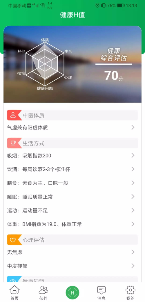 用户填写完整的健康档案获得健康H值综合评分。综合评分是依据体质、心理、慢病、健康问题、生活方式、其他因素六个维度给出的综合评定。