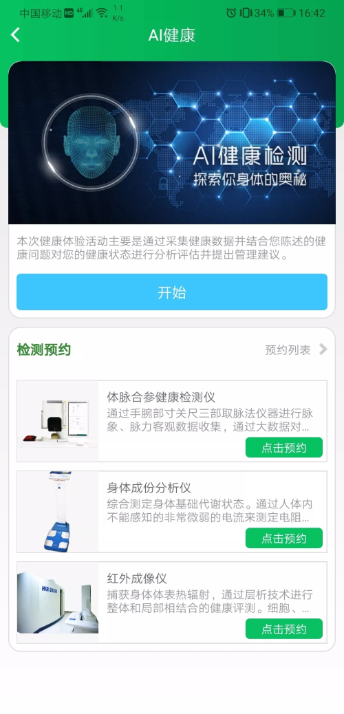 检测预约功能主要提供AI健康评估以及体脉合参健康检测仪、呼吸气体检测仪、红外热成像健康检测仪、身体成分测试仪等检测设备的体验预约,用户在线选择设备及体验时间,灵活调整到店时间及检测项目,实现用户健康数据的客观化采集及分析。