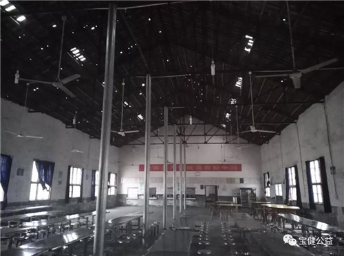 由于学校建设年代久远(1972年建校),部分校舍已超期服役,相关设施设备过于陈旧。其中,学校食堂餐厅建于上世纪八十年代建设,已出现墙壁开裂,钢制屋架锈蚀严重、屋面塌陷、漏雨、门窗腐朽、线路老化等现象,存在着很大的安全隐患,急需拆除新建。