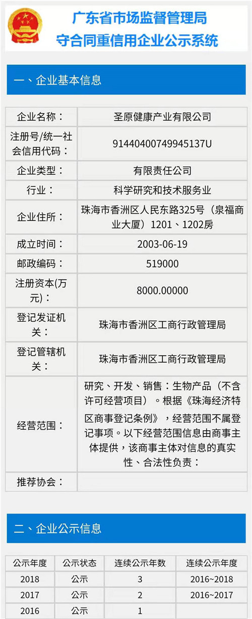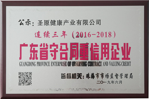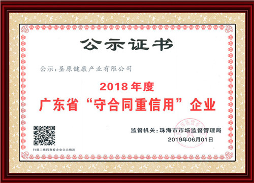 近日,2018年度“广东省守合同重信用企业”名单正式公布,圣原健康产业有限公司位列其中,这是圣原数年如一日地守法经营、深入推动诚信建设所取得的成果。
