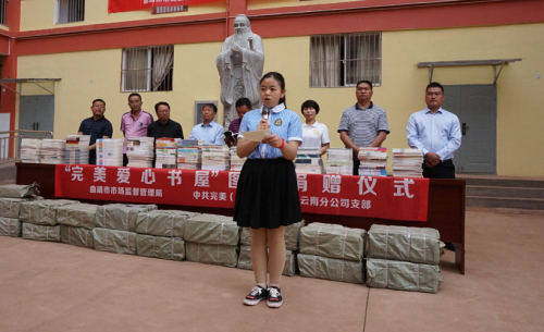 7月5日,云南分公司党支部携手曲靖市市场监督管理局,到曲靖会泽县上村乡中学举行“完美爱心书屋”图书捐赠活动,为当地中、小学捐赠价值10万元图书1万余册,助力上村乡脱贫攻坚。