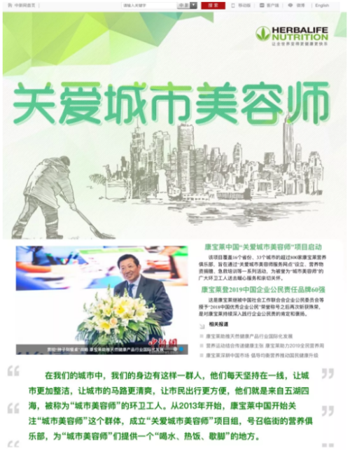 为了向这些被誉为“城市美容师”的广大环卫工人送去暖心服务和亲切关怀,全球知名的美国营养品公司康宝莱于今年5月启动了2019年康宝莱中国“关爱城市美容师”项目。项目内容包括“关爱城市美容师服务网点”的设立、营养物资捐赠以及急救培训等一系列活动,将覆盖16个省份、33个城市的超过800家康宝莱营养俱乐部。全国知名媒体中新网专门对该活动进行了系列追踪报道。