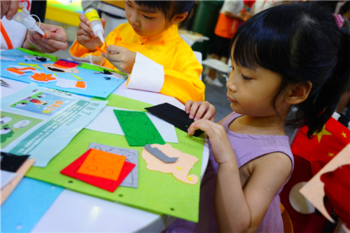 在“手工布书制作”体验区,志愿者耐心地引领儿童制作专属自己的一本不织布手工书,感受动手及阅读带来的另一种快乐。