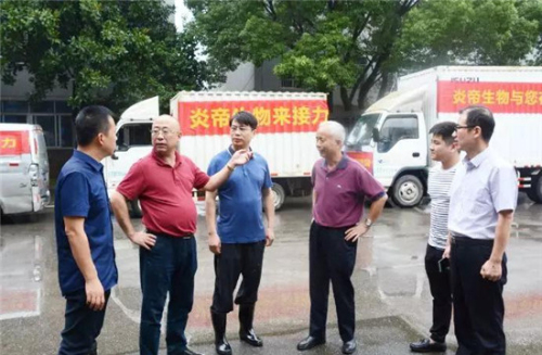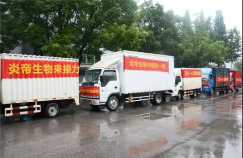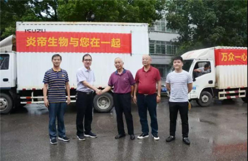 2019年7月14日,在了解情况后,炎帝生物迅速行动,调集6台货车,出资10万元购买矿泉水、方便面、八宝粥等灾区急需物资,在炎帝监事会主席陈牧、行政中心总经理万义的带领下赶赴三门赈灾。