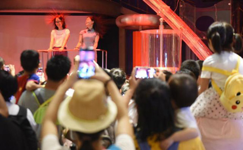 物理馆内的静电“爆炸头”表演吸引了很多亲子围观