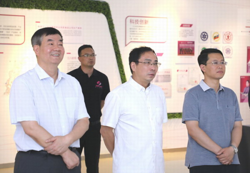 单舒平书记(右二)和张辰宇院长(右三)及袁晓峰董事长共同参观企业展厅